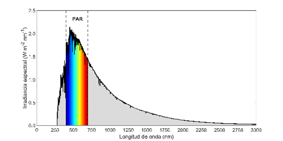 La radiación fotosintéticamente activa (PAR), acrónimo que viene por sus siglas en inglés Photosynthetically Active Radiation, corresponde a la porción de la radiación solar que alcanza la superficie terrestre cuyas longitudes de onda se encuentran en la banda que va desde los 400 hasta los 700 nm. Esta es la porción del espectro solar que utilizan los organismos fotosintéticos y coincide con el espectro visible para el ojo humano. La PAR es un dato necesario en aplicaciones dedicadas a la producción de biomasa, la iluminación natural en invernaderos, la fisiología de las plantas, el balance energético en ecosistemas, la producción de algas o los estudios de sumideros de carbono, entre otras.